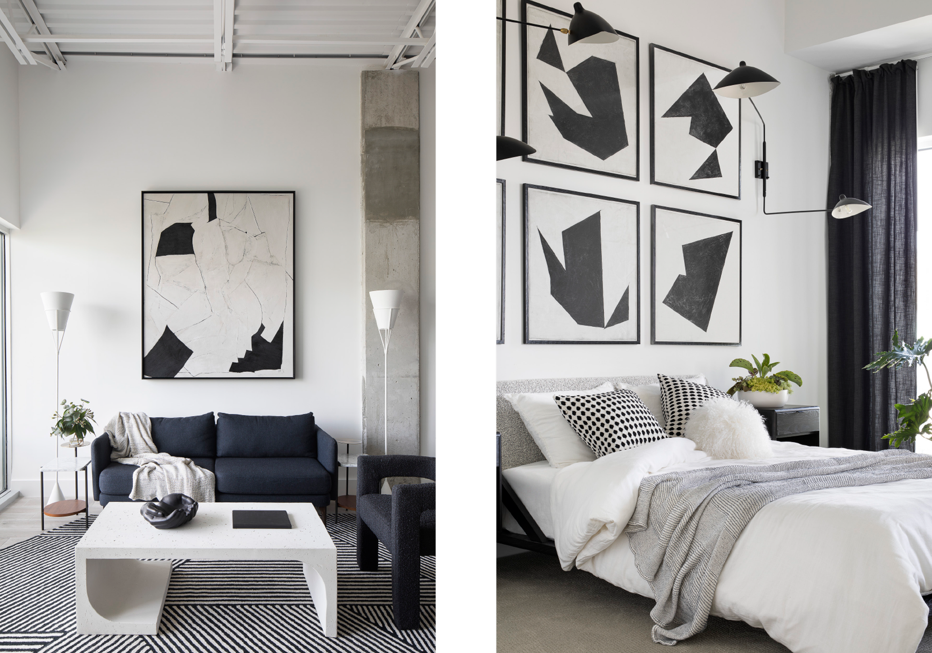 The penthouse is designed with large waterfall kitchen islands, edge pulls, and large format tiles for a sleek look. It also has the latest smart home products such as Ecobee Smart Thermostats, USB/Lightning outlets, and a Samsung Smart Fridge.